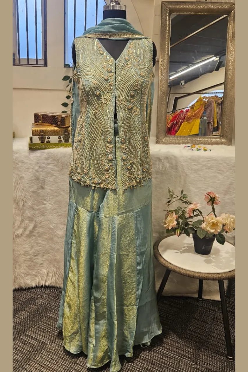 Tissue A-Line Kurta Palazzo Set with Cutwork Embroidery